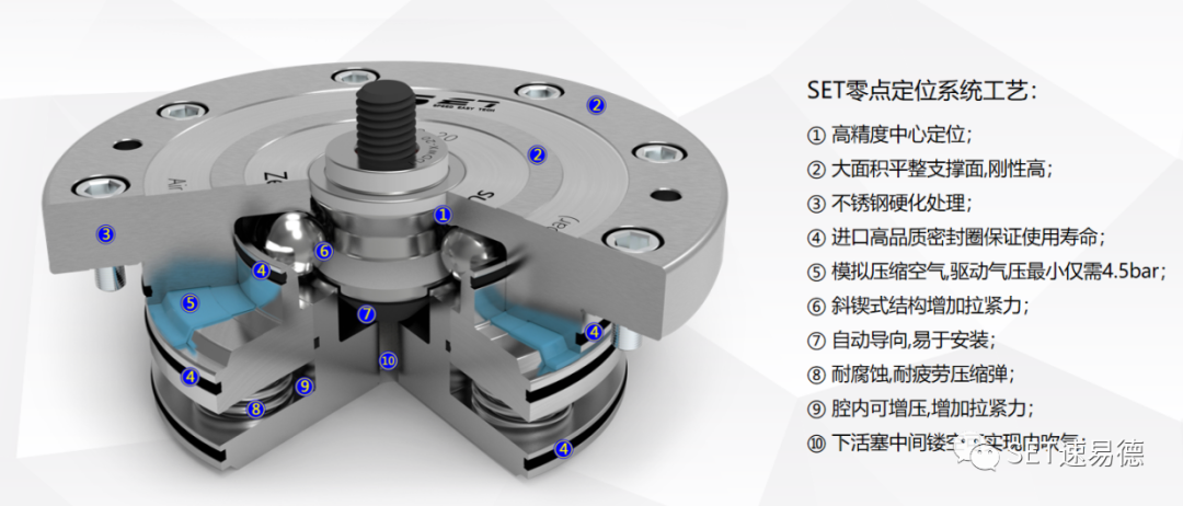 제로 포인트 포지셔닝 시스템은 잠금 메커니즘에 속하며, 이는 환기 중에 열리고 공중에서 잠겨 있습니다. 유압 또는 공기압이 제로 위치 지정 시스템에 적용되면 압력은 피스톤을 통해 아래의 스프링을 압축하고 강철 볼은 양쪽으로 퍼집니다. 클램핑은 내부 강한 스프링에 따라 다르며 정상 작동 중에는 공기원이 필요하지 않습니다. 빠른 변경 시스템은 다양한 유형의 포지셔너 모듈로 구성되며, 사용은 동일하지 않으며, 신체 변화, 손톱도 변경되며, 포지셔너, 포지셔닝 핀, 오리엔테이션 핀, 잠금 핀은 고전적인 "한쪽 두 핀"위치에 속합니다.