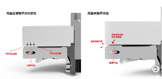 트레이의 안정성을 보장하고 포지셔닝 요구 사항을 충족시키기 위해 제로 포지셔너는 클램핑 감지 장치를 추가해야합니다.이 장치의 목적은 제로 포지셔너가 트레이의 포지셔닝 표면에 완전히 접촉 할 수 있으며 중간에 철분 절단 또는 다른 잔해물이 없도록하는 것입니다. 그것의 작동 원리는 그림 (1)에 나와 있습니다. 감지 공기는 구멍 외부에서 (0.2mpa) 공기 압력을 방출합니다. 흐름 센서의 등급 값을 설정하십시오. 도 2에 도시 된 바와 같이 트레이가 포지셔너와 평평하지 않은 경우, 감지 된 이스케이프 가스는 갭을 따라 바깥쪽으로 빠져 나가고 흐름 센서는 흐름 차이를 결정하여 클램핑 감지를 실현할 것이다. 감지 구멍은 또한 기공 청소를 보장하기 위해 0.6MPa 청소 압력을 바깥쪽으로 분사합니다. 여러 로케이터가 동시에 감지 될 수 있으므로 비용이 줄어 듭니다. 2. 다중 포지셔너에 누출 흐름 값이 있으면 사전 설정 흐름 값과 일치하지 않으므로 더 안전합니다. 3. 감지 방법이 더 직접적이며 트레이가로드되지 않으며 포지셔너 빈 클립을 감지 할 수 있습니다.